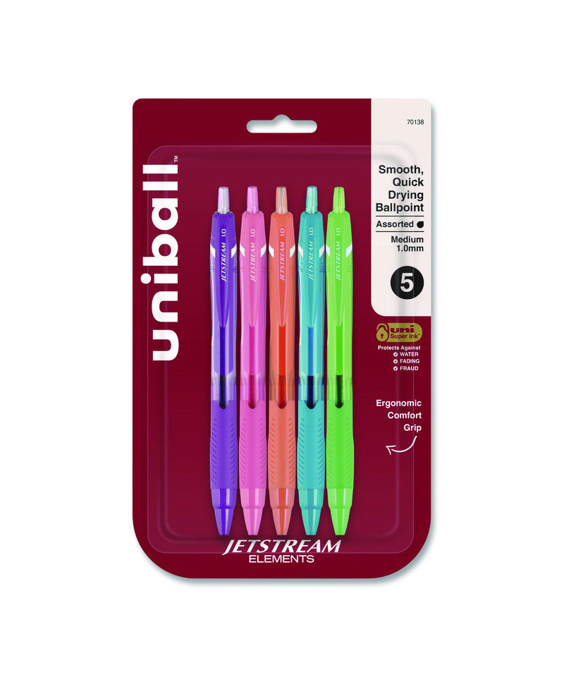 Inspire creativity with Jetstream™ Elements Ballpoint Pens from uni-ball®. These pens feature an innovative hybrid ink that combines the quick-drying properties of a ballpoint with the smoothness and vibrancy of a gel pen. Whether it's color-coding notes and lists or uniquely embellishing fun and creative writing projects, these Jetstream™ Elements ballpoint pens are suitable for a variety of projects. A contoured grip ensures greater comfort for extended writing and creating. uni Super Ink™ technology forms a strong bond with the paper, protecting your work from water, fading and fraud. You are simply left with exceptionally smooth and crisp lines. Jetstream™ Elements ballpoint pens give all of your ideas a burst of brilliant color.