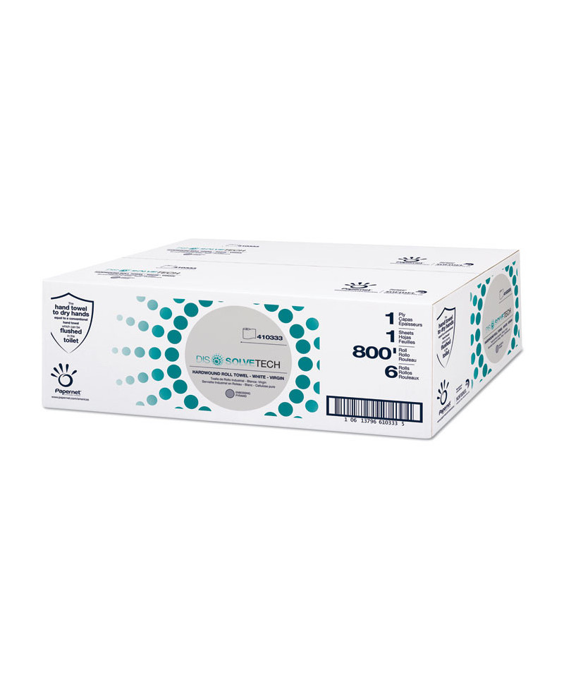 High wet strength that ensures the resistance and absorbency of a normal hand towel during hand drying while reducing the risk of clogs within pipes. After three minutes, towel's wet strength dissipates making DissolveTech® technology behave in a similar way to toilet paper.