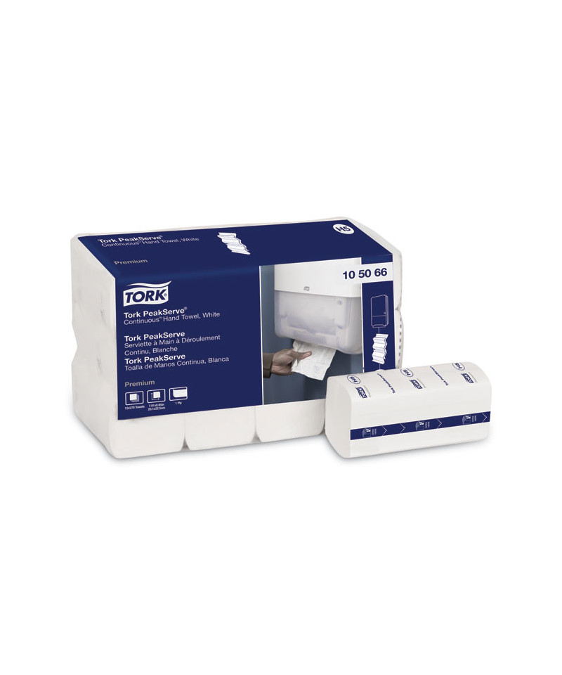 Tork® PeakServe® Continuous™ Hand Towels means fewer washroom delays—gets guests in and out faster. Avoid run outs with 250% more hand towels and lower consumption thanks to one-at-a-time dispensing. Faster dispensing serves guests in three seconds—quicker than jet air drying time. Taking a towel is always smooth and easy with our patented continuous towel system. More flexibility means more time to clean. Top it up when it suits you with up to 600 more guests served between refills. Double the towels you carry as they're compressed by 50%. Cut refill time in half with over 2,000 towels per dispenser. Poly bag wrapped.
