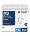 The Premium paper hand towel impresses with its softness, brightness and absorbency. These products enhance an upscale restroom experience by fitting in seamlessly. The art of impressing your guests starts here. The Tork Premium Multifold Hand Towel is premium quality with superior softness and absorbency to help dry hands quickly. Available in an Easy Handling Carry Box, and ideal for medium traffic restrooms.