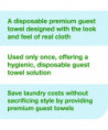 Impress guests with the exceptional quality and elegance of our cloth-like disposable guest hand towels, designed with the look and feel of real cloth. Each towel is noticeably softer and bulkier than standard guest towels, providing the ultimate in absorbency, hand feel, and overall quality. Best of all, there are no hidden costs such as linen service fees, replacement fees, or laundering costs. Each hand towel is used only once, ensuring a hygienic experience for guests. This product contains 100% virgin fibers and comes poly-wrapped to protect the guest towels.
