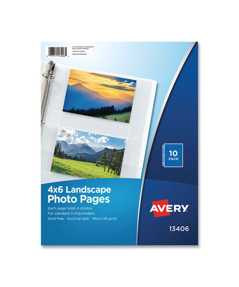 Display your photos with variety suitable to your diverse subject matter. Avery® Photo Pages are perfect for your photos. Three protective photo pockets offer the option of portrait and landscape orientation on the same page so you can properly appreciate your photos of both soaring skyscrapers and sunsets that stretch the length of the horizon. Prepunched holes let you fit the pages conveniently in standard three-ring binders. The pages are acid-free and archival-safe to ensure your many photos stay in top condition to show off again and again.