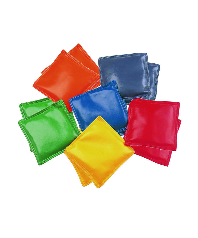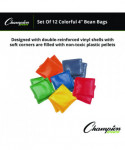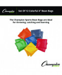 Liven up playtime with the Champion Sports 4" Bean Bag Set. This pack of 12 bean bags is ideal for young children. Each bean bag is 4" in size and made with soft, double-reinforced vinyl shells that are comfortable to catch and easy on little hands. Filled with non-toxic plastic pellets, these bean bags are safe for playtime. The set comes in a vibrant mix of colors, including 2 red, 2 orange, 2 yellow, 2 green, 2 blue, and 2 purple. Perfect for tossing games that help develop motor skills and hand-eye coordination.
