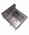 This one-compartment sink is constructed with durable 18-gauge T-304 stainless steel and comes equipped with a 9" high backsplash, 8" on-center splash mount faucet holes, and 1.5" rolled edges on the front and sides. Additionally, it includes a drain basket for added convenience. The galvanized steel legs come with adjustable plastic bullet feet for stability. The package also includes the WorkForce 8" on-center faucet with an 8" swing spout.