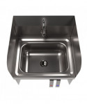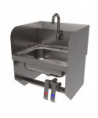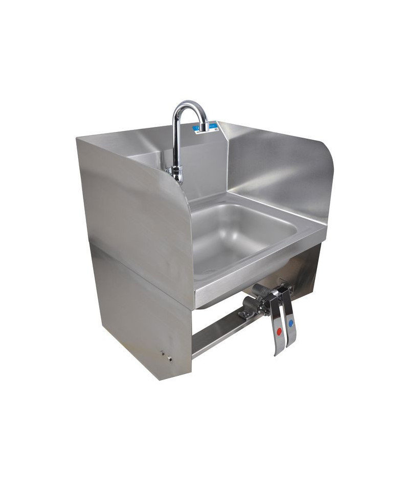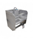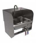 This wall-mounted hand sink is designed for efficiency, featuring a 14" l x 10" w x 5" d bowl size. It comes equipped with a 1.88" basket drain complete with a crumb cup for easy maintenance. The sink incorporates a knee valve with a 3.5" gooseneck spout, ensuring hands-free operation. The single-hole splash mount and dual-side splash add to its functionality. With quarter turn ceramic cartridges, the sink offers reliable performance. While wrist blade handles are not available, the sink includes both knee and wall brackets for secure installation. Crafted from T304 stainless steel, it combines durability with practical design.