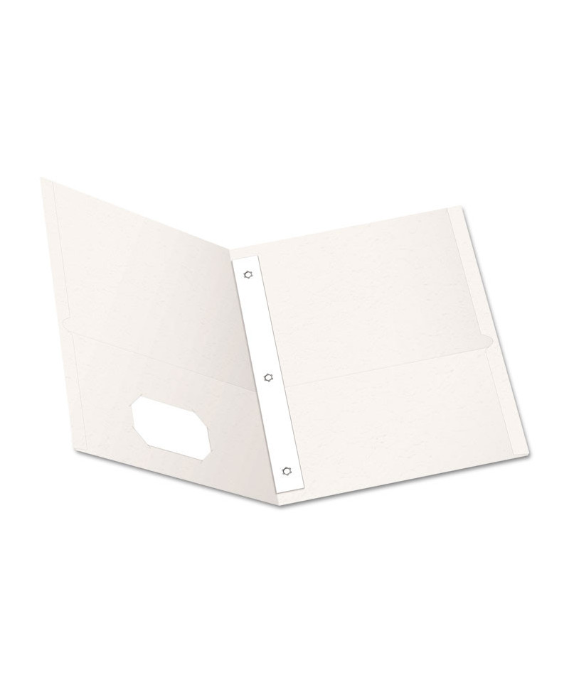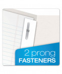Holds 135 sheets of letter size paper (85 sheets in fasteners, 25 sheets per pocket). Leatherette embossed paper. Die-cut business card holder on inside pocket, Contains post-consumer paper.