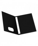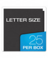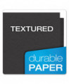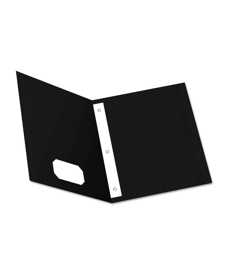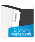 Holds 135 sheets of letter size paper (85 sheets in fasteners, 25 sheets per pocket). Leatherette embossed paper. Die-cut business card holder on inside pocket, Contains post-consumer paper.