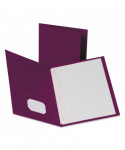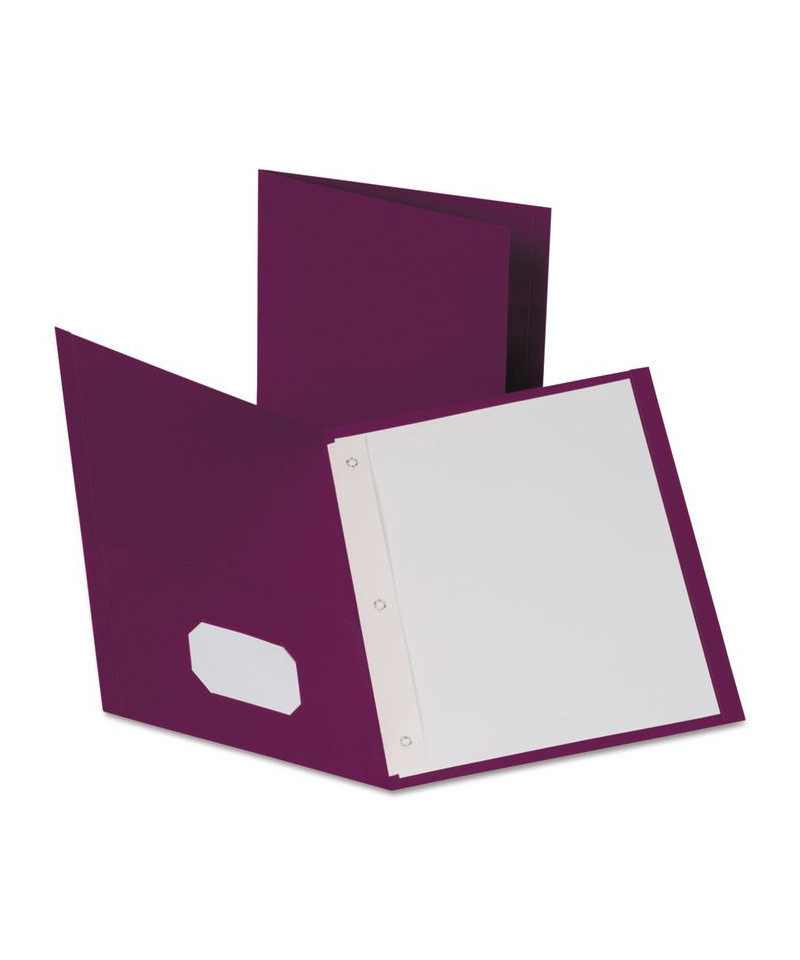 Holds 135 sheets of letter size paper (85 sheets in fasteners, 25 sheets per pocket). Leatherette embossed paper. Die-cut business card holder on inside pocket, Contains post-consumer paper.