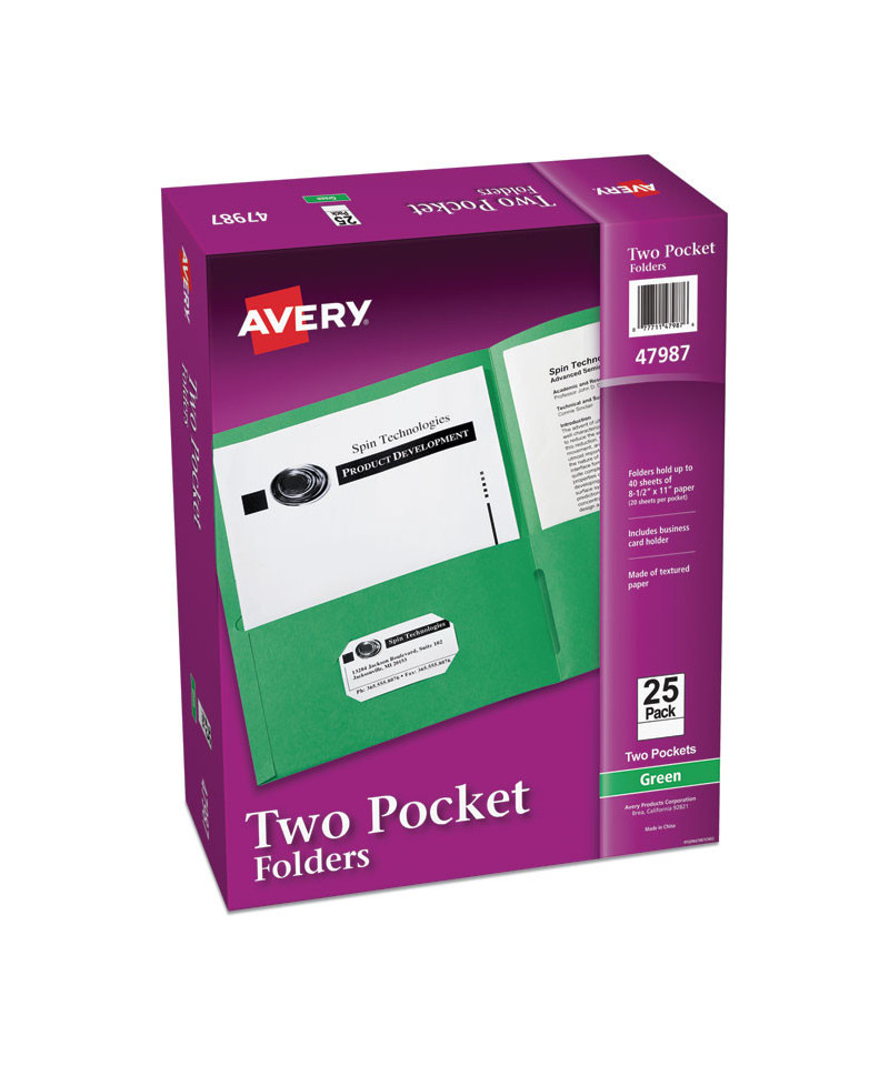 Keep your documents organized with Avery Two Pocket Folders. The textured paper 8" x 11.5" document folder features two internal pockets designed to hold a variety documents. Use the folders to create school folders for the upcoming next semester, presentation folders for a trade show, office folders to hold important project documents, and more. Load and unload documents at ease as each pocket corner includes built-in open side notches designed for easier access to your pages. These paper folders also allow you to write on or add a label to its cover. Holds up to 40 sheets of paper (20 per pocket).
