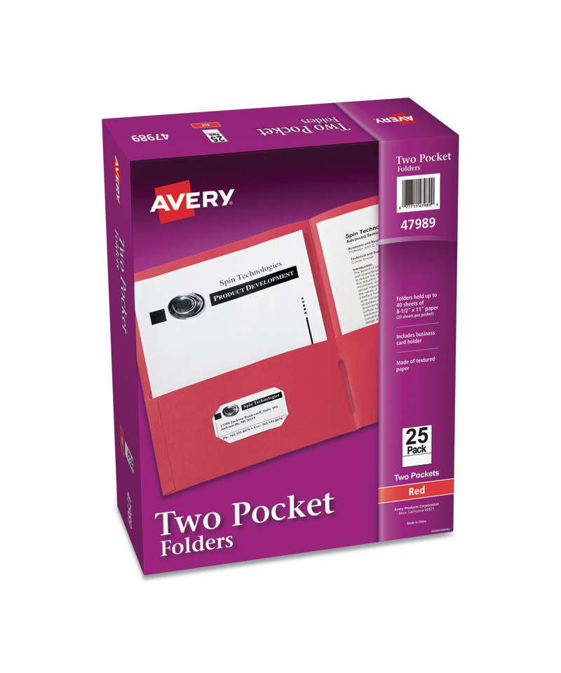Keep your documents organized with Avery Two Pocket Folders. The textured paper 8" x 11.5" document folder features two internal pockets designed to hold a variety documents. Use the folders to create school folders for the upcoming next semester, presentation folders for a trade show, office folders to hold important project documents, and more. Load and unload documents at ease as each pocket corner includes built-in open side notches designed for easier access to your pages. These paper folders also allow you to write on or add a label to its cover. Holds up to 40 sheets of paper (20 per pocket).