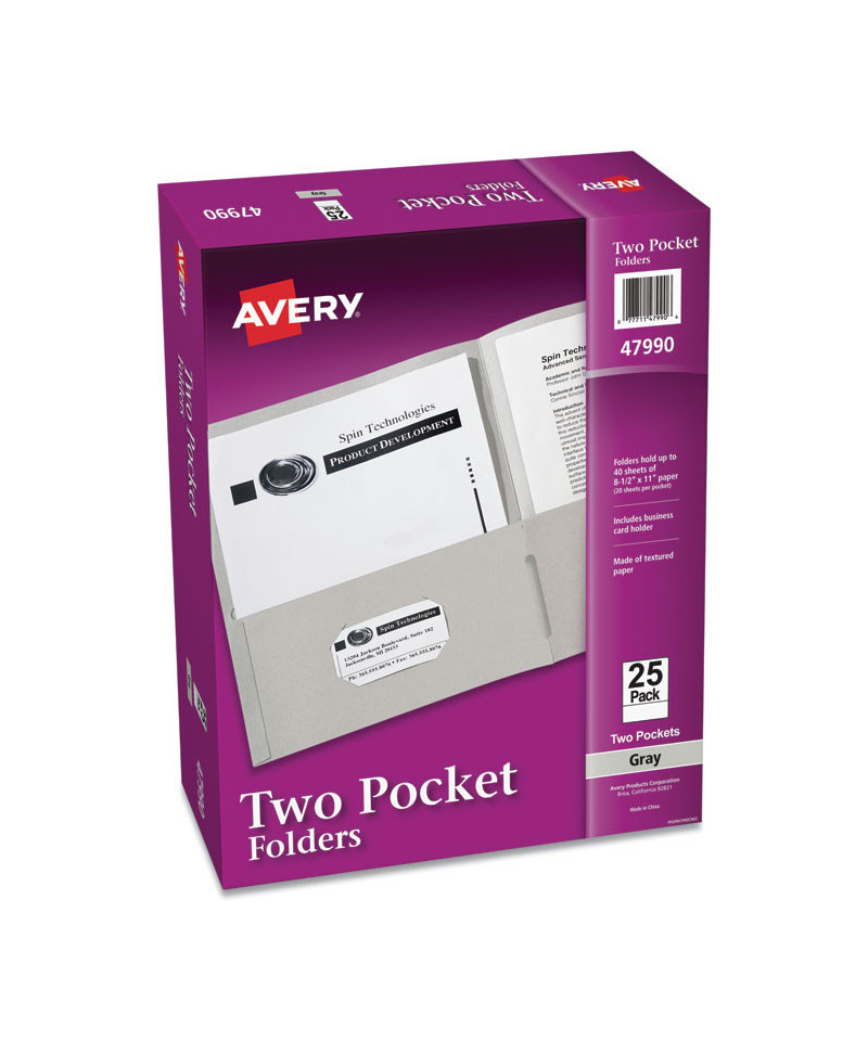 Keep your documents organized with Avery Two Pocket Folders. The textured paper 8" x 11.5" document folder features two internal pockets designed to hold a variety documents. Use the folders to create school folders for the upcoming next semester, presentation folders for a trade show, office folders to hold important project documents, and more. Load and unload documents at ease as each pocket corner includes built-in open side notches designed for easier access to your pages. These paper folders also allow you to write on or add a label to its cover. Holds up to 40 sheets of paper (20 per pocket).