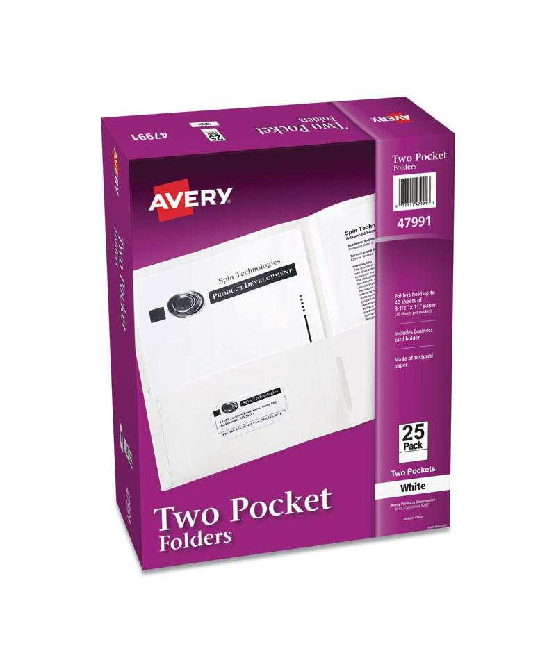 Keep your documents organized with Avery Two Pocket Folders. The textured paper 8" x 11.5" document folder features two internal pockets designed to hold a variety documents. Use the folders to create school folders for the upcoming next semester, presentation folders for a trade show, office folders to hold important project documents, and more. Load and unload documents at ease as each pocket corner includes built-in open side notches designed for easier access to your pages. These paper folders also allow you to write on or add a label to its cover. Holds up to 40 sheets of paper (20 per pocket).