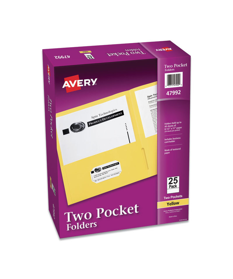 Keep your documents organized with Avery Two Pocket Folders. The textured paper 8" x 11.5" document folder features two internal pockets designed to hold a variety documents. Use the folders to create school folders for the upcoming next semester, presentation folders for a trade show, office folders to hold important project documents, and more. Load and unload documents at ease as each pocket corner includes built-in open side notches designed for easier access to your pages. These paper folders also allow you to write on or add a label to its cover. Holds up to 40 sheets of paper (20 per pocket).