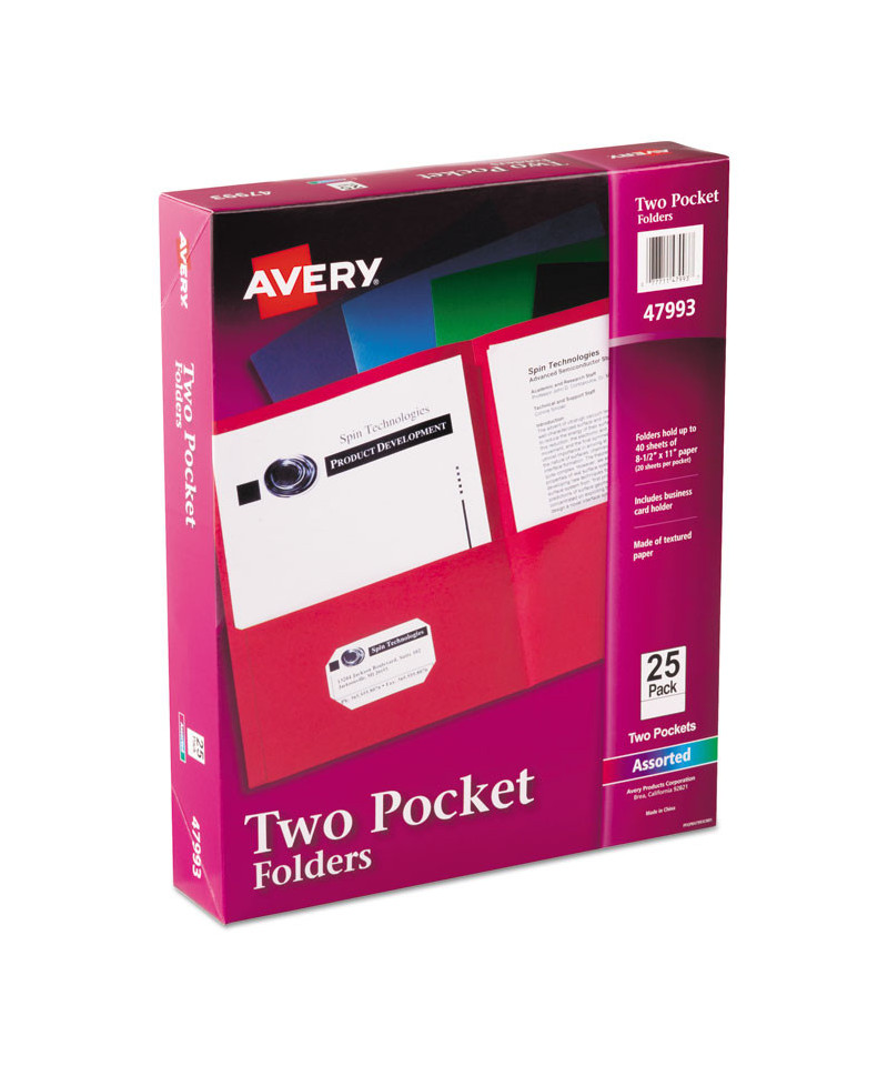 Keep your documents organized with Avery Two Pocket Folders. The textured paper 8" x 11.5" document folder features two internal pockets designed to hold a variety documents. Use the folders to create school folders for the upcoming next semester, presentation folders for a trade show, office folders to hold important project documents, and more. Load and unload documents at ease as each pocket corner includes built-in open side notches designed for easier access to your pages. These paper folders also allow you to write on or add a label to its cover. Holds up to 40 sheets of paper (20 per pocket).