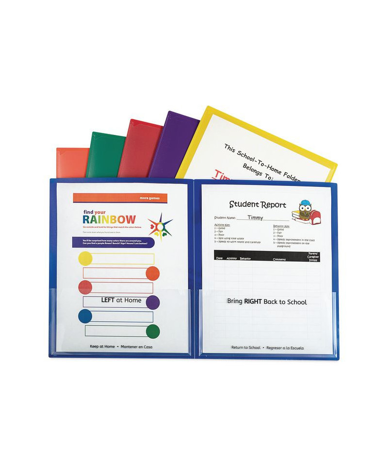 Make the connection between school and home stronger with these school-to-home two-pocket folders. Keep parents and caregivers informed with daily updates on lessons, projects, behavior and more. The interior pockets are imprinted with "Home" and "School" designations, in both English and Spanish. Front and back cover pockets are clear, making them great for custom student cover sheets. Made of durable polypropylene. This product will be cheerfully replaced with one of equal value if defective in materials, manufacturing or packaging at the time of purchase. Except for such replacement, this product is sold without warranty or liability even though defect, damage or loss is caused by negligence or other fault.