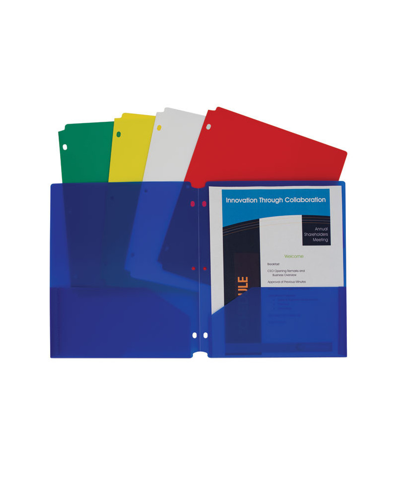 With the help of these unique two-pocket folders, letter-size papers can stay organized, while still remaining accessible in your three-ring binder. Two-pocket heavyweight polypropylene folders with three-hole punch hold papers and resist tearing. Features three-hole punching for secure storage in standard three-ring binders. Cut-outs at the top and bottom keep portfolio from being caught in binder open-close mechanism. This product will be cheerfully replaced with one of equal value if defective in materials, manufacturing or packaging at the time of purchase. Except for such replacement, this product is sold without warranty or liability even though defect, damage or loss is caused by negligence or other fault.