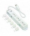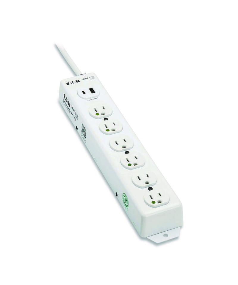 Features six NEMA 5-15R-HG hospital-grade outlets that supply power to equipment used in areas outside patient care vicinities, including nursing stations, pharmacies, office and administration areas and labs. This power strip has a NEMA 5-15P-HG "green dot" plug and meets UL 1363 standards. One USB-A port and one USB-C Power Delivery (PD) port let you charge smartphones, tablets and other vital mobile devices. The USB-C PD port provides up to 30 W. The Safe-IT power strip is protected by an antimicrobial coating that helps resist the growth of bacteria, viruses, fungi, mold and mildew. With no central power switch, this power strip presents no danger of accidental shutoff and cutting off power to essential devices. Locking plastic safety covers are included to block access to unused outlets. The two-foot cord connects the power strip to a standard NEMA 5-15R wall outlet. Built-in mounting flanges let you mount the all-metal housing to a stable, flat surface. Scan the Easy Asset QR code on the side of the power strip to access product resources and other critical information.