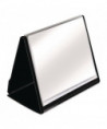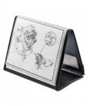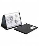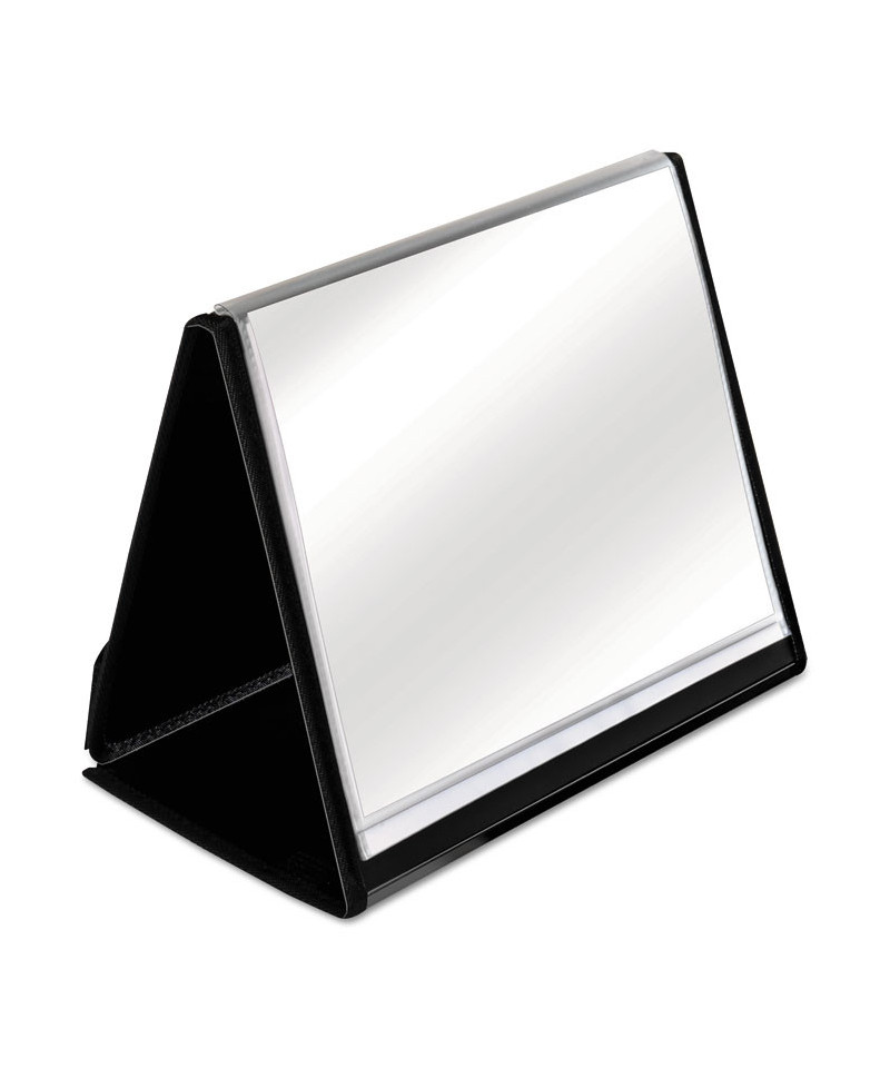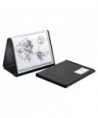 Hook and loop strips hold the book open in standing position or closed. 20 clear, transfer-safe poly pockets that provide 40 letter-sized display pages. Black poly cover with clear business card holder on cover.