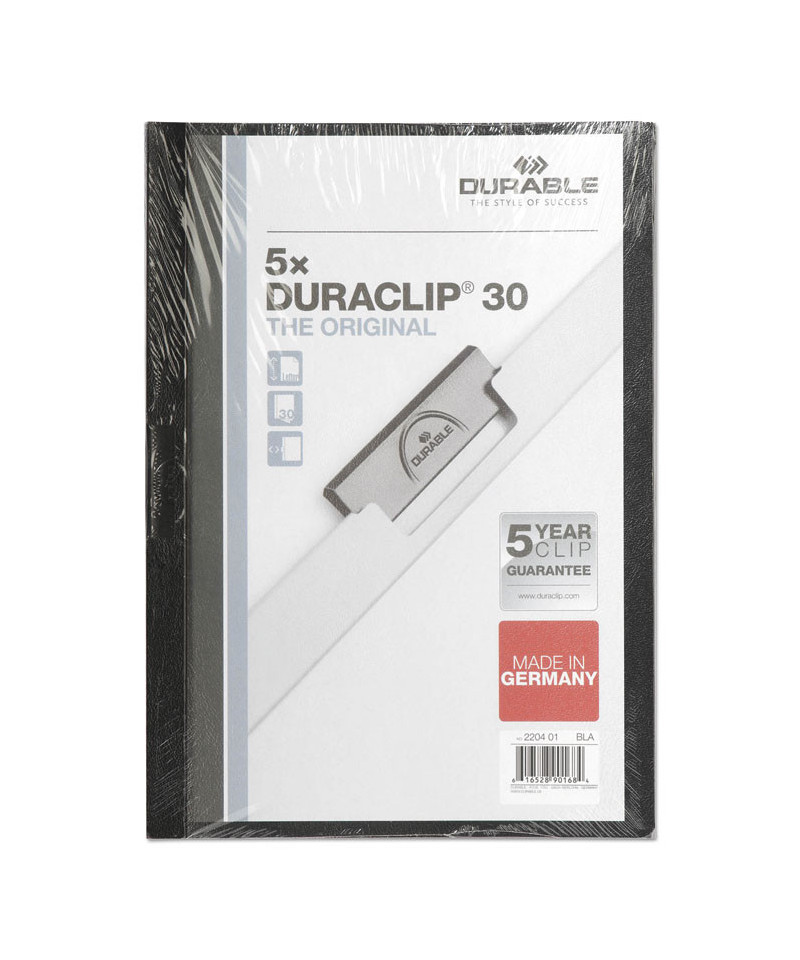 The polished look of DURACLIP® Report Covers immediately grabs attention, setting the stage for stylish and impactful presentations. But it doesn't stop there the punchless design saves you valuable time, and the first-class materials maintain their long-term professional appearance. The folder is made of vinyl with a sleek and refined finish, providing a tactile and visual experience that communicates professionalism. The clear, high-quality plastic front cover adds a layer of sophistication and conveniently displays your first page without the need to open the report. The punchless design streamlines assembly, allowing you to organize and present your materials in record time. No more hole-punching, bulky prongs, or complicated binding insert your pages and slide the clip in place. This means you can also add and remove pages quickly. From single pages to substantial presentations, these DURACLIP Report Covers securely hold up to 30 pages. For over 100 years, DURABLE® has been synonymous with quality, design, and functionality. That's why DURACLIP isn't just a report cover; it's a commitment to presenting your business professionally. This superior report cover keeps pages in pristine condition. The steel slide-in clip locks your documents safely. This unparalleled quality and attention to detail ensures your presentations make lasting impressions.
