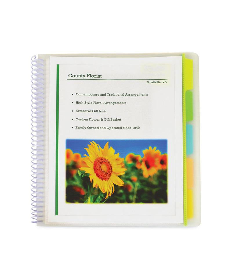 Organize projects, subjects, notes and more in one convenient place. Suitable for both students and professionals. Ten interior pockets allow for detailed organization. Write-on tabs make for quick and easy custom organization; works with pencil, ball point pen or permanent marker. Spiral-bound portfolio features clear-view front pocket for cover sheet. Made of heavyweight acid-free polypropylene. For 8.5" x 11" document storage. Clear cover and pockets with assorted color tabs. This product will be cheerfully replaced with one of equal value if defective in materials, manufacturing or packaging at the time of purchase. Except for such replacement, this product is sold without warranty or liability even though defect, damage or loss is caused by negligence or other fault.