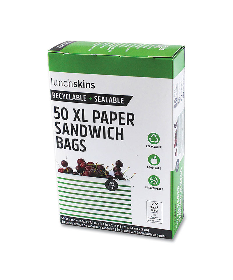 Finally, a disposable XL sandwich bag you can feel good about using, and the box is designed to fit perfectly in your kitchen drawer. Remove the self-adhesive closure strip to seal in freshness. This durable and naturally grease-resistant paper bag by LunchSkins is recyclable and sealable. Great for subs, hoagies, baguettes, hero sandwiches, and much more. Use at home or on the go.