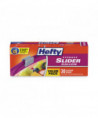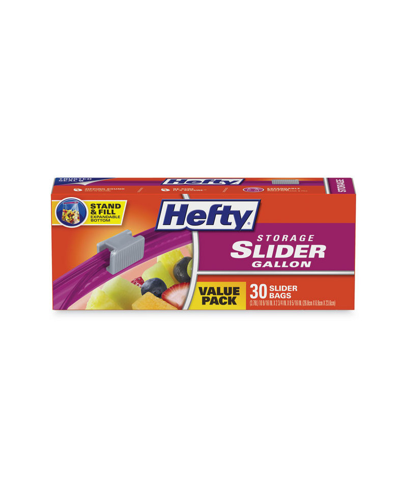 Reclosable, double-zipper food storage bags with two-layer seal locks out air and keeps freshness in. Write-on label for date and ID.