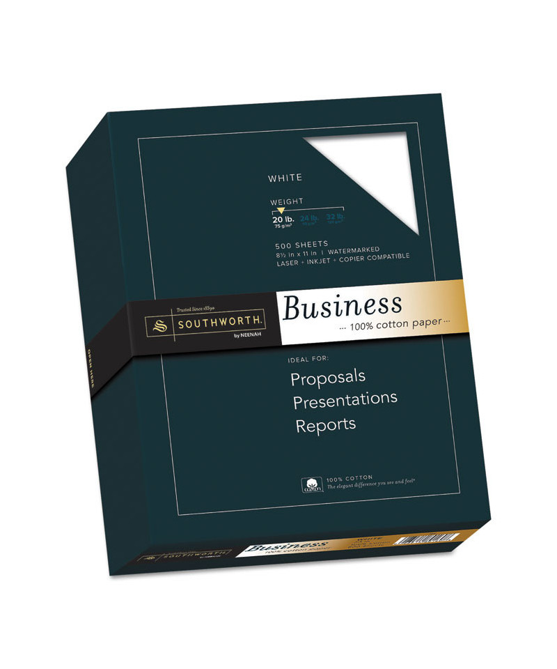Southworth® 100% Cotton Business Paper conveys prestige with the unmistakable feel of 100% cotton fiber. The elegant texture, durability and color reproduction of cotton convey prestige for all your important documents. Perfect for presentations, reports, proposals, invoices, legal documents and more. Get personal with paper! Your choices say a lot about you and your business. The Southworth® collection of business papers is among the truly finest papers available for professional offices of any size. Communicate in style-from the first moment to enduring memory, cotton paper adds a touch of class, making first impressions more impressive with a distinct crispness and an unmistakable feel. Someone picking up your document will know, before they even read a single word, that there's something special to it. Cotton fiber also provides archival durability-it's the reason so many historic documents are still with us even centuries later.