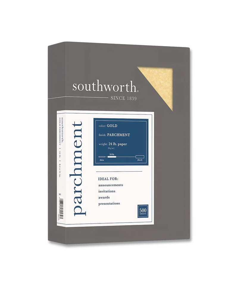 Create professional documents with this Southworth Parchment Specialty Paper. The parchment finish produces a sophisticated appearance, while the 24-pound material delivers a high-quality feel. This 1" parchment specialty paper offer is acid-free and lignin-free, so ink won't life off printed pages, allowing for documents to be archived.