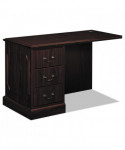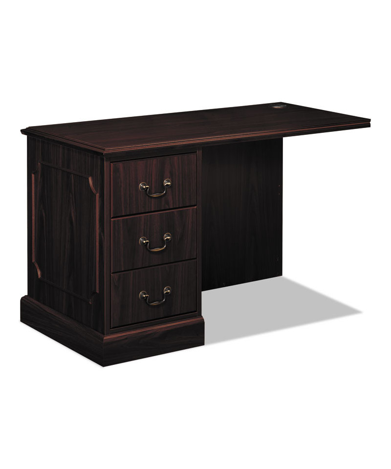 18th century elegance, 21st century engineering. Mirror-finish, high-pressure laminate top. Woodgrain laminate end panels and drawer fronts. Traditional style with distinctive plinth base. File drawer extends fully, box drawer extends three-quarters, both on steel ball bearing suspensions. Antique brass-plated hardware. Desk and Return sold and shipped separately—ORDER BOTH.