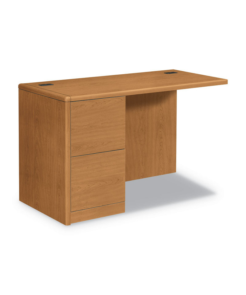 Make your work space work for you with this left return. Simply combine this left return with a right desk, right credenza or peninsula of your choice to create an L-workstation. Exclusive reinforced pedestal construction makes this HON® desk withstand daily wear and tear. Soft, waterfall-shaped edges provide a comfortable typing surface. Includes two file drawers for documents. File drawers have built-in hangrails to accept hanging file folders. All drawers lock using the same key; lock core can be changed as security needs require. Drawers glide on steel ball-bearings for years of smooth, reliable performance. Concealed openings in the pedestals allow cords to be routed inside the unit.