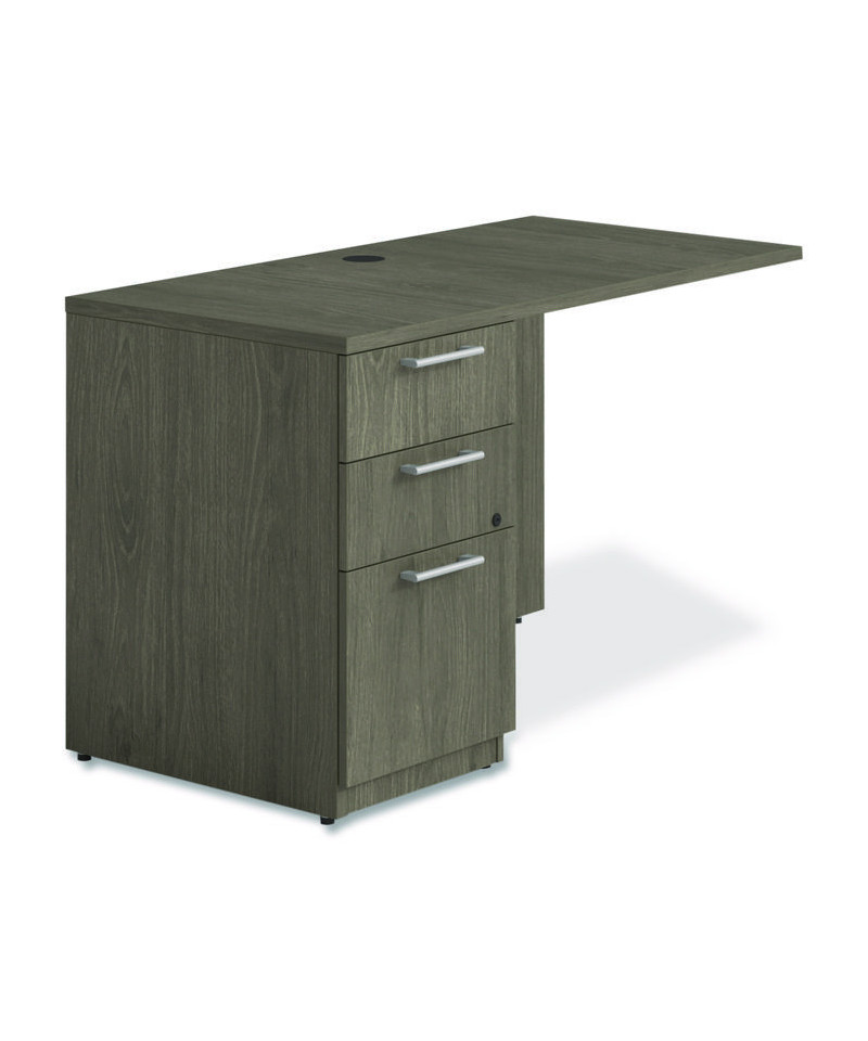 Introducing the Alera Seville Series Desk Return with Pedestal. The return is a versatile addition to your office setup, designed to pair seamlessly with pedestal desks or credenzas for creating efficient L-shaped or U-shaped workstation configurations. Made from durable particleboard, this extension features a band edge design that adds strength and durability to its construction. The surface is finished with high-quality laminate that not only offers a sleek, professional look but also provides excellent resistance to impacts and burns, ensuring long-lasting use in busy office environments. Equipped with adjustable glides that allow for easy leveling on uneven surfaces, ensuring stability and comfort.