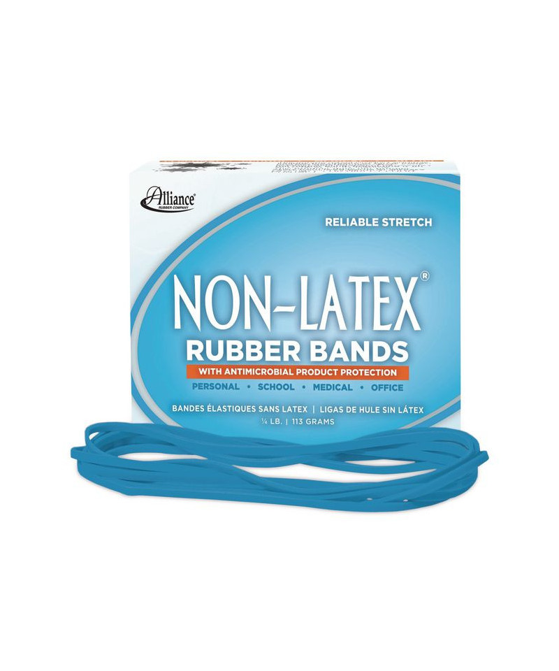 Non-latex, antimicrobial rubber bands are made from synthetic rubber. The antimicrobial product additive inhibits the growth of fungi, molds and bacteria that can cause early product deterioration. The antimicrobial treatment permeates the rubber band, protecting it on all surfaces for its lifetime. This product does not protect users from food borne or disease causing microorganisms. Not for use on direct food contact.