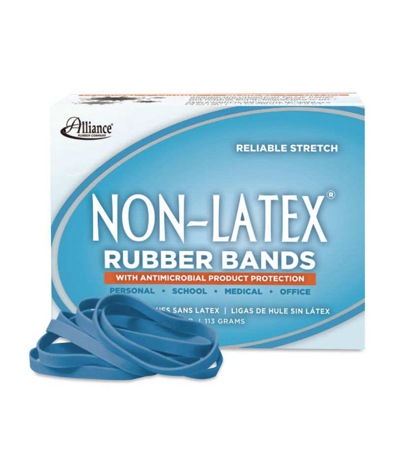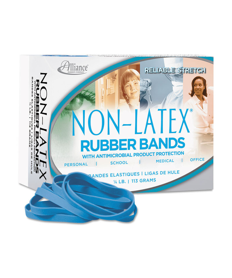 Non-latex, antimicrobial rubber bands are made from synthetic rubber. The antimicrobial product additive inhibits the growth of fungi, molds and bacteria that can cause early product deterioration. The antimicrobial treatment permeates the rubber band, protecting it on all surfaces for its lifetime. This product does not protect users from food borne or disease causing microorganisms. Not for use on direct food contact.