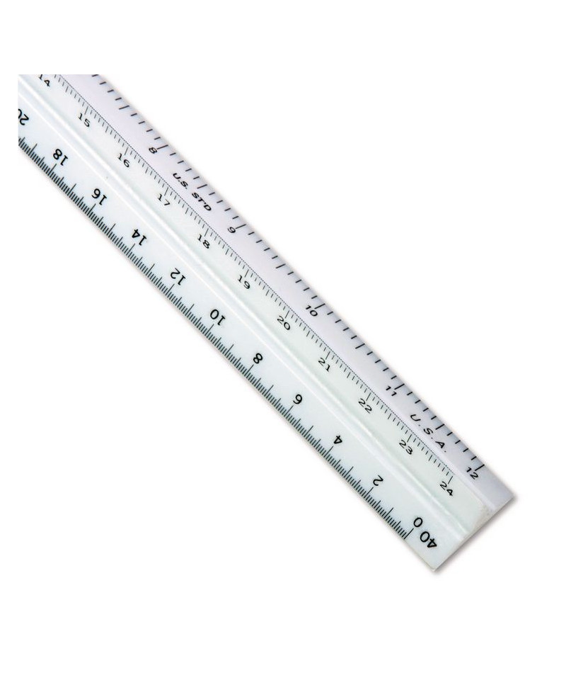 Triangular scale delivers the precision and versatility engineers require, making it an indispensable tool. Features three sides with six different scales. Full divided: 10, 20, 30, 40, 50 and 60 parts to the inch. White plastic.