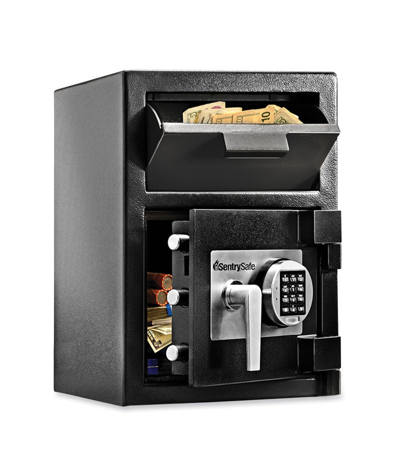 Depository safe is a must have for security conscious business managers. It’s uniquely designed to protect cash receipts, deposit slips, keys and other valuables against theft and burglaries at the point of purchase. Reduce your chance of being robbed by making frequent deposits in your drop safe container. Designed with a host of security features including hardened steel lock plate, programmable electronic locks, anti-fish hoppers and anti-pry doors. Bolt-down included.