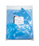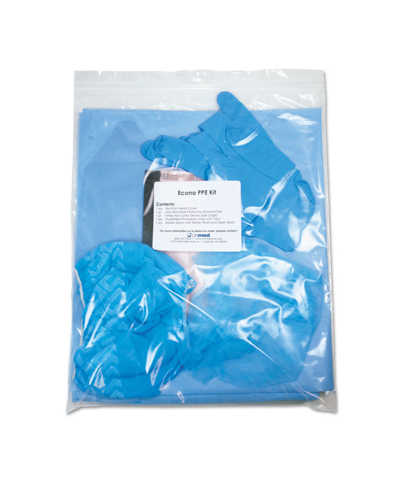 Comprehensive personal protection supplies in one convenient kit. Provides fluid-resistant coverage from head to toe, for a variety of uses. Features fluid-impervious gown and mask—recommended for procedures with bodily contact. Packaged in an easy-to-use, easy-to-store clear zip bag. Single-use kit contains head protector, pair non-skid shoe Protectors, fluid-impermeable mask with safety shield, fluid-impervious barrier gown with elastic cuffs, pair nitrile exam gloves, size large.