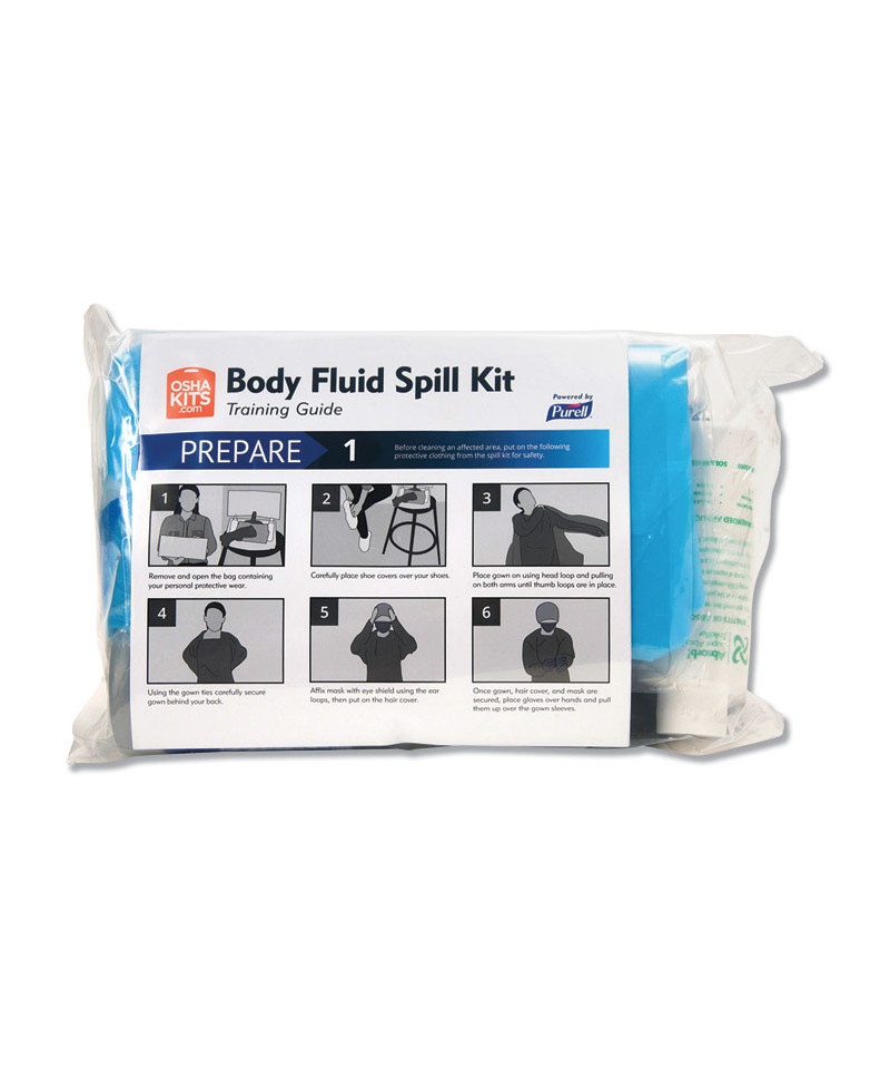Simplify your response process to body fluid spills with PURELL Body Fluid Spill Kits. Each kit features PURELL Foodservice Surface Sanitizer, proven on a variety of hard and soft surfaces, including food-contact surfaces with no rinse required. Quickly kill 99.9 percent of common germs that may cause illness with the surface sanitizer one-step formula complies with FDA Food Code and OSHA. The included head-to-toe personal protection and clean-up products ensure you can safely remove vomit, blood, feces, other body fluids, and broken glass. Each fully disposable kit helps avoid unnecessary biohazardous waste pickup fees and reduces clean-up time.