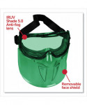 KleenGuard™ Personal Protective Equipment (PPE) enables rather than inhibits—allowing for maximum productivity and safety for you and your employees. When you have a job to tackle that involves flying particles or splashes, wearing safety glasses isn't enough. Protect yourself with the KleenGuard™ V90 Shield Safety Goggles with Face Shield, with IRUV Shade 3.0 Anti-Fog Lenses (protects against infrared and ultraviolet radiation for light cutting and brazing applications). It's really like having two products in one, since the face shield mask detaches from the splash goggles. Together, they provide eye and full face protection from liquids and particles without the hassle of primary eye protection underneath a face shield mask. The protective goggles feature an indirect vent that enables free airflow, while safeguarding against liquids entering the eye area. The goggles portion has a soft, pliable frame that conforms to the face for comfort, a cylindrical lens for increased visibility, and indirect ventilation. They can fit over most prescription eyeglasses. The face shield mask is curved to conform to the shape of face for added protection. The Shield includes an adjustable strap, so that your workers can get a snug fit. Perform with distinction with KleenGuard™ Personal Protective Equipment (PPE).