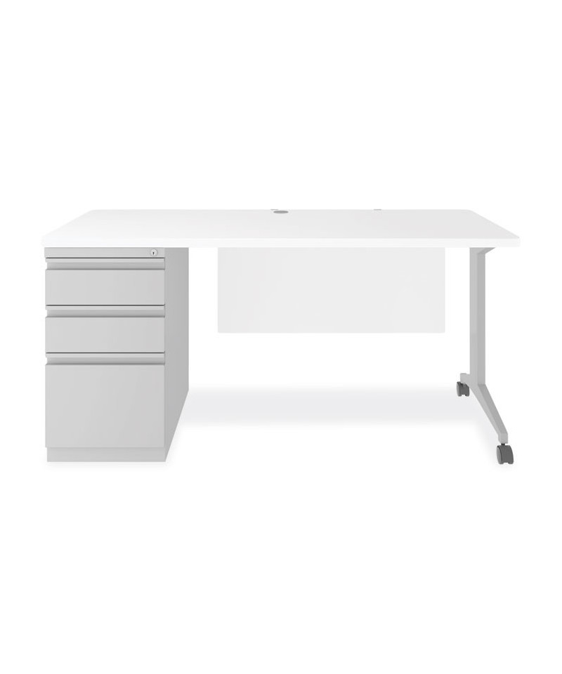 Durable, easy to clean, easy to disinfect laminate worksurface is supported by a swivel-caster equipped T-leg on one side and a mobile pedestal on the other. The worksurface also features a T-mold edge-band for safety. Full-height pedestal features hidden casters and locking drawers with full-width drawer pulls.