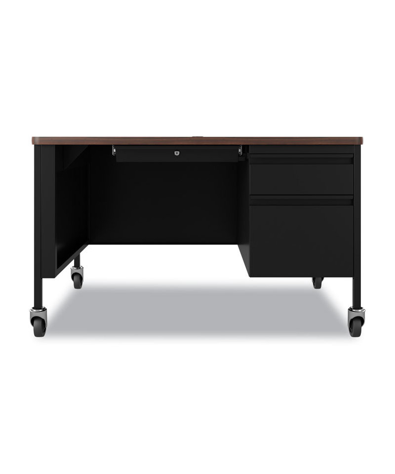 Designed specifically with the modern classroom in mind, these teachers' desks are an attractive, practical solution for any educational environment. Each desk features sturdy, heavy-gauge steel pedestals, legs and privacy panels along with an easy to clean, laminated worksurface with rounded corners and a protective T-mold strip. All drawers employ a full-extension, precision ball-bearing suspension system.