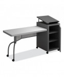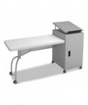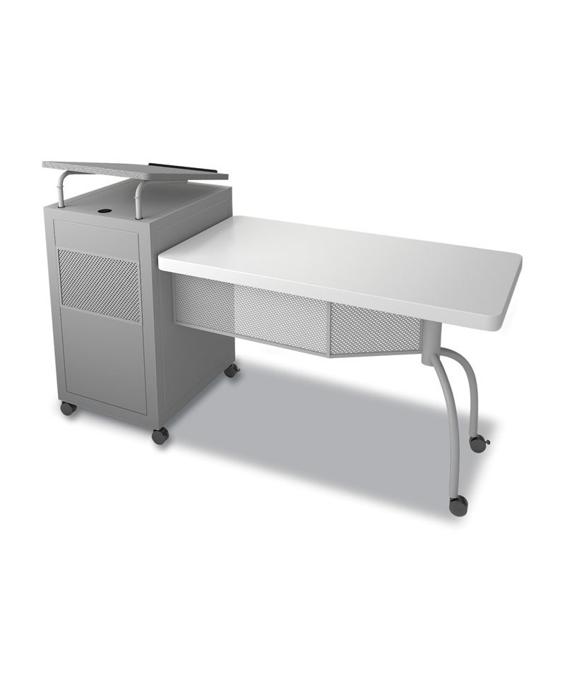 Edupod is the perfect solution to the 21st century educational environment. Incorporating both a lectern and teacher's desk in one, the Edupod accommodates both sitting and standing presentations. The unit's attractive hammer tone steel lectern cabinet with adjustable-height shelves connects to a gorgeous lightweight blow-molded plastic desktop in matching color. The unit's desk portion is mounted on a contemporary frame and leg system with a matching modesty panel. Preset the adjustable-height lectern top with metal book stop to match your personal comfort zone and height requirements. Wire management grommets on the lectern cabinet allow for use of technology while the built-in attractive mesh front provides venting to prevent overheating. Includes six double-wheel hooded, 2 casters (three locking) for portability.
