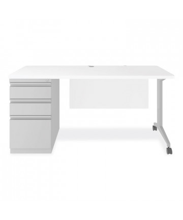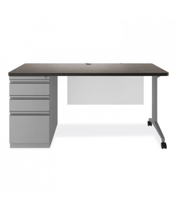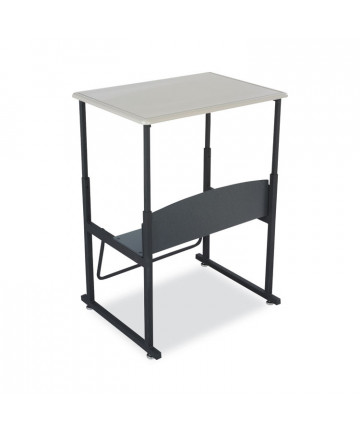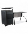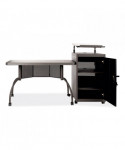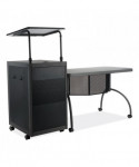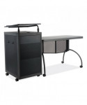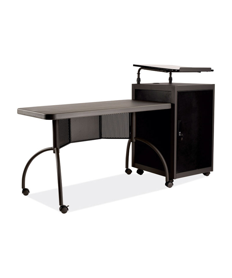 The Teacher's WorkPod Desk and Lectern from Oklahoma Sound® offers you both a desk and lectern to be used together or as separate standalone units. The WorkPod includes an attractive charcoal slate and black steel lectern. The white nebula reading surface with metal bookstop can be set to your personal comfort zone and height requirement. Store all your supplies in the locking storage cabinet with adjustable height shelves. Wire management grommets on lectern cabinet allow for use of technology equipment such as projectors, laptops or tablets, and built-in attractive mesh front provides venting to prevent overheating. The 48 x 24 WorkPod Desktop is made from heavy-duty plastic blow mold with extra framing underneath for heavy duty use. The desktop can be mounted on either side of the lectern on a contemporary frame and leg system with modesty panel. Double-wheel hooded casters offer you an ultra-durable and mobile unit. So sit or stand, lecture as you see fit the choice is yours!
