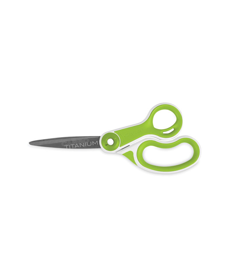 Patent-pending CarboTitanium® blade-bonding technology, one of the hardest titanium-surface treatments available. Industrial-strength blades easily cut through multiple layers of fabric, cardboard, canvas, vinyl magnets and more. Blade surface will not chip, flake or peel. Scissors have a unique ergonomic over mold and high-strength handle.