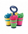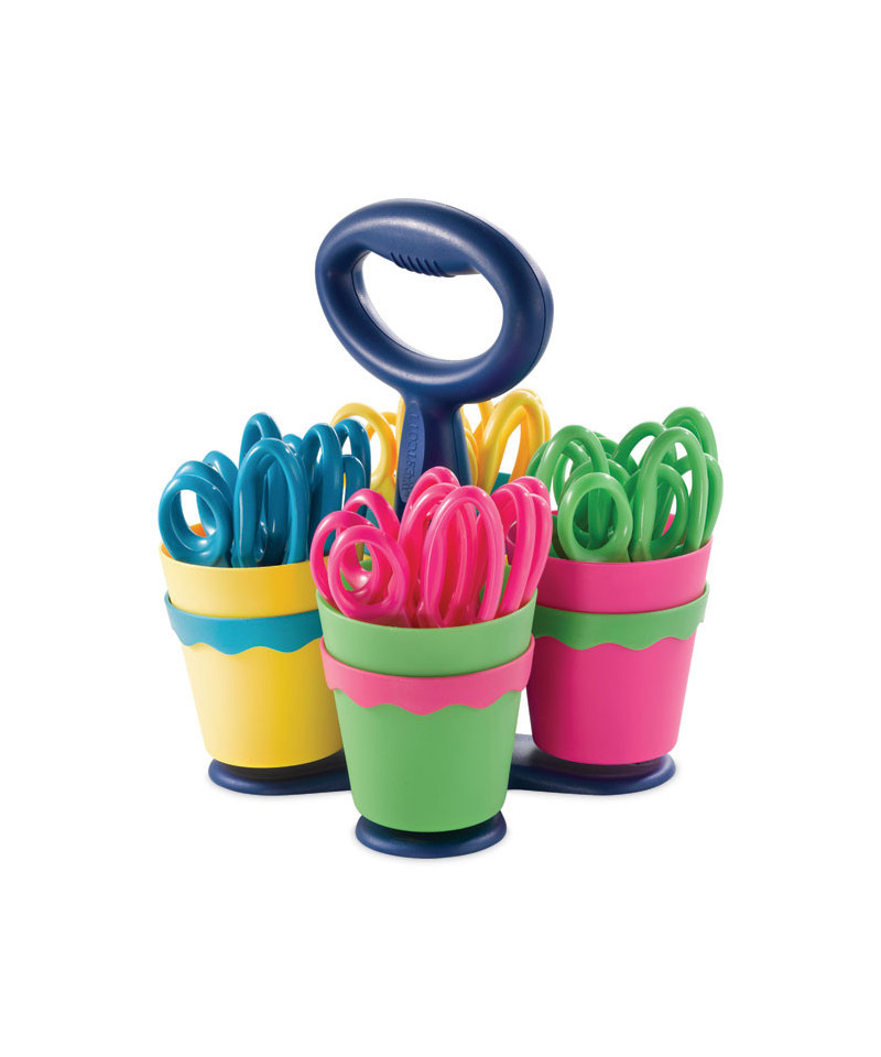 Convenient classroom-size caddy. Scissors have plastic handles and safety blades. Scissor handles and caddy are infused with antimicrobial product protection to inhibit the growth of bacterial odor.
