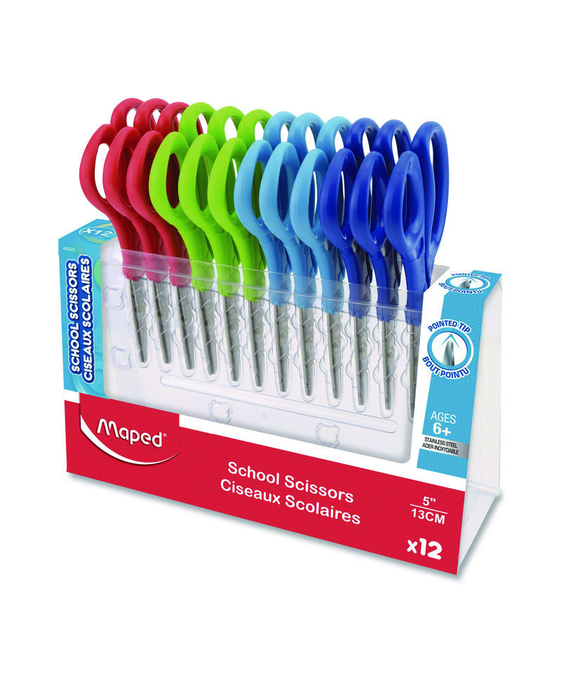 Maped Helix Essentials Kids School Scissors are perfect for young students going back to school! Modern design features pointed tip stainless steel blades with a rounded tip that is safer than others you can find on the market and are much more appropriate for young students. Eye-catching asymmetrical handles are perfect size for young hands to hold and are perfect for students six years and up. Packed in a reusable School Pack perfect for classrooms, camps, daycares and more.