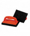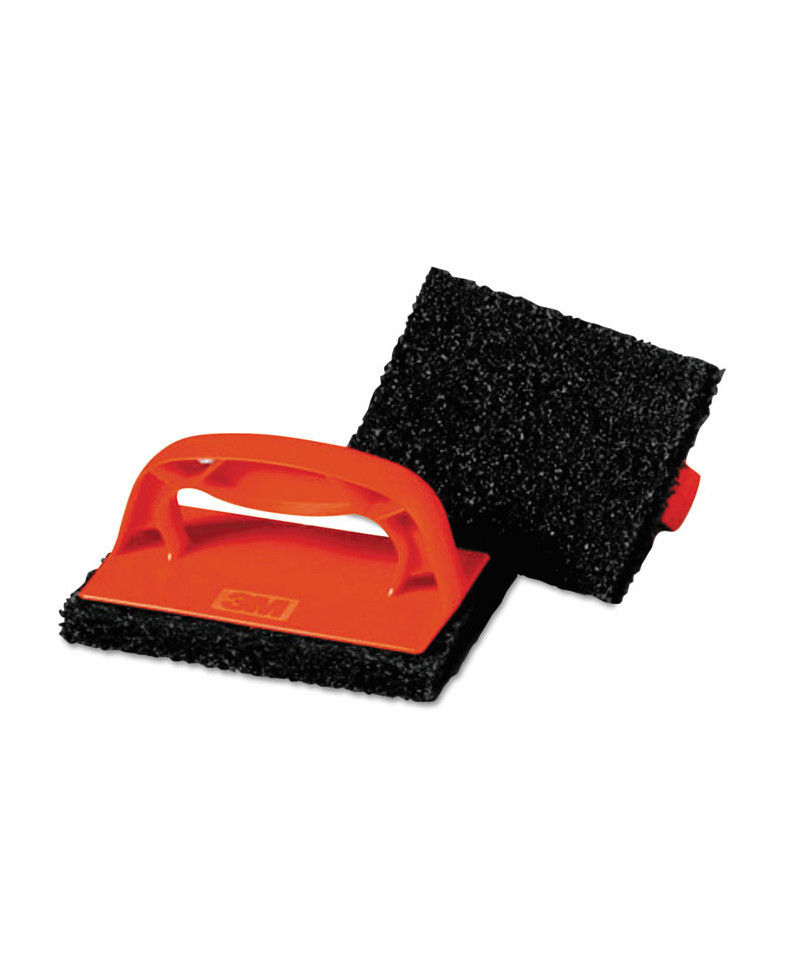 This easy-to-use, one-piece griddle scrubber is for flat griddles at any operating temperature. The built-in, heat-resistant handle helps protect hands from burns, grease and grime. The heavy-duty, open, non-woven pad construction resists clogging and easily rinses clean – allowing numerous uses. Causes no unpleasant odors or residues and is dishwasher safe.