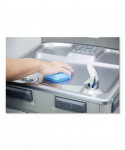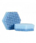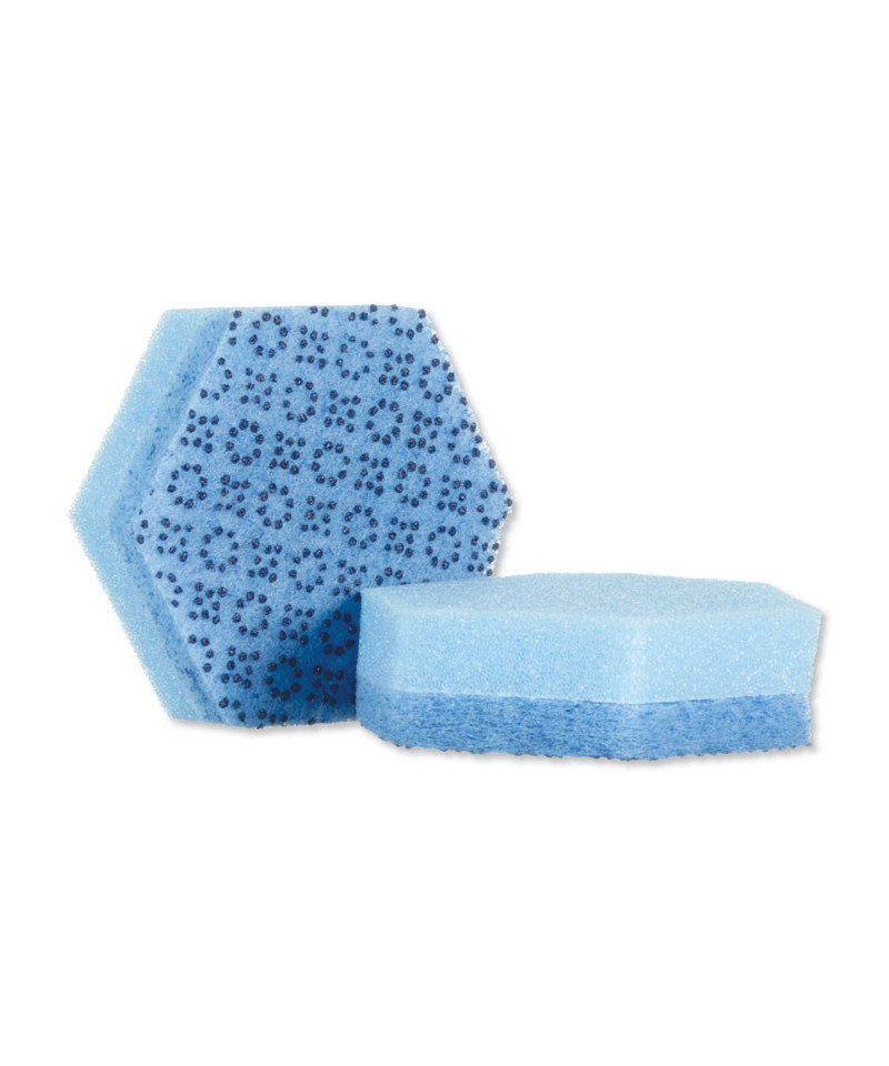Maximize your cleaning efficiency with this low-scratch scour sponge. This two-in-one scour pad features innovative raised power dots on the dark blue side of the pad, designed to scour away tough messes, while its light blue cellulose sponge side contains antimicrobial technology that resists the growth of odor-causing bacteria in the sponge for longer-lasting use and visibly cleaner surfaces. The scour sponge works aggressively to cut through baked-on or burnt-on food faster, while also producing less visible scratches, making it great for multi-purpose cleaning. The ergonomic hexagon shape of the pad fits comfortably into the user's hand, making it easy to clean hard-to-reach areas, no matter which side you're using.