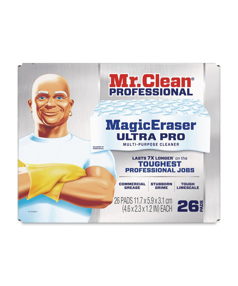 Mr. Clean® PRO Magic Eraser Ultra Pro is a powerful multi-purpose cleaning sponge that lasts 7x longer than the Original Magic Eraser—our longest-lasting eraser for tough professional jobs! This cleaning pad is 60% thicker than the Extra Durable Magic Eraser, providing a comfortable grip and enhanced cleaning power. It effectively reaches into surface grooves to clean the toughest soils. Just wet, squeeze and erase to remove tough dirt, grease, grime, limescale and scuff marks from your business's walls, doors, floors, non-finished surfaces and more. As a powerful cleaner, Ultra Pro makes cleaning easy.