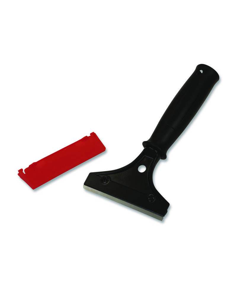 This 8" Window/Floor Scraper is ideal for scraping soil off windows and floors. Equipped with a 4" double-sided carbon steel blade; razor edge for scraping tape and paint as well as a blunt edge for stucco and cement. Equipped with a durable plastic sheath that eliminates potential safety hazard when not in use. Ergonomic handle ensures comfort during use. Hanger hole allows for easy storage.