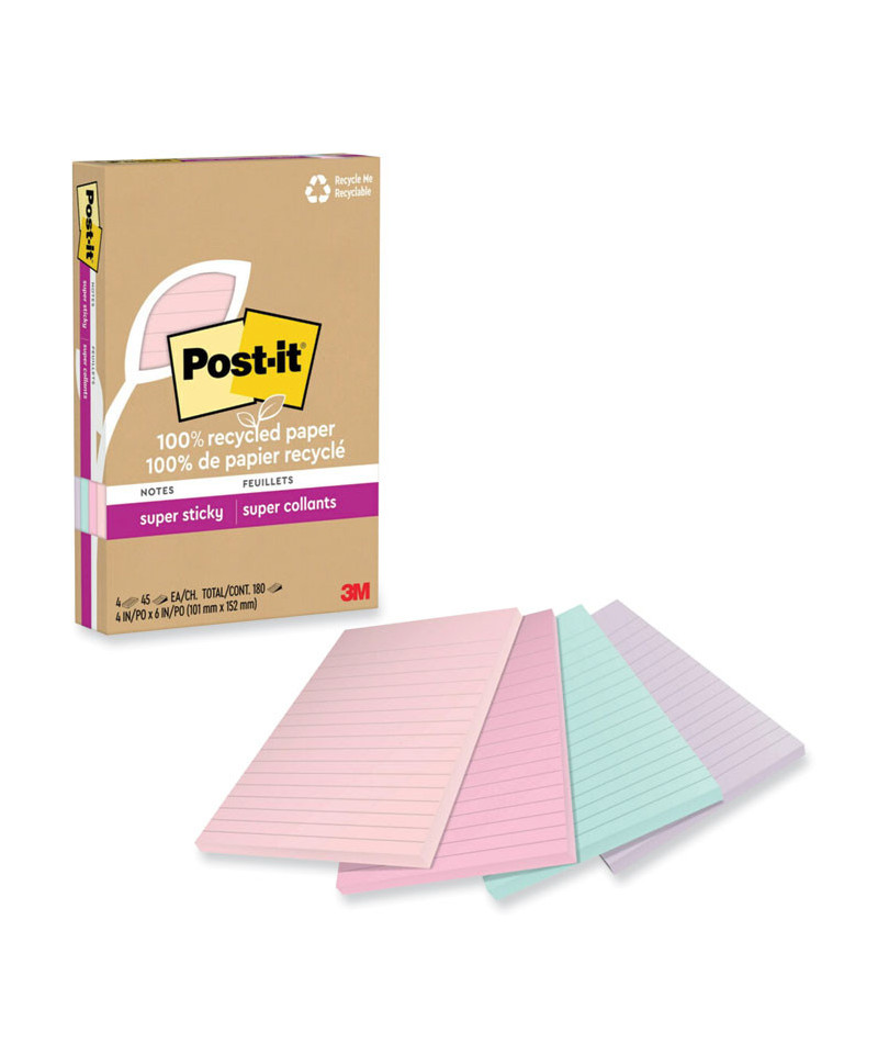 100% Recycled Paper Super Sticky Notes, Ruled, 4" x 6", Wanderlust Pastels, 45 Sheets/Pad, 4 Pads/Pack